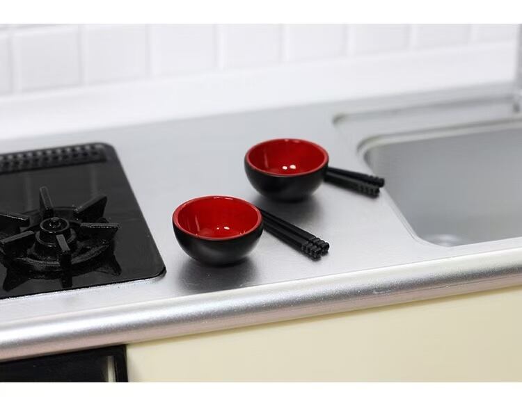 ミニチュアドールハウス用 箸とお椀セット 黒赤 ドールハウスお碗 小さな食器 マイクロサイズのプレート ドールハウスのテーブルウェアアクセサリー
