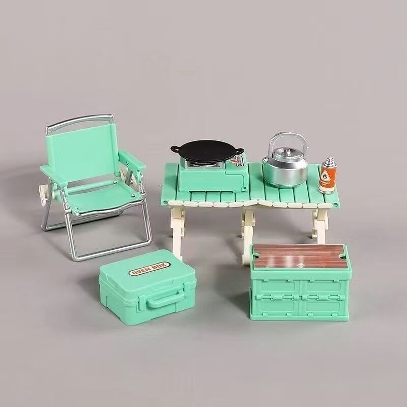ミニチュア キャンプ アウトドア8点セット ミント テーブル ローチェア ガスコンロセット グリルパン ケトル 折りたたみ収納ボックス ドールハウス